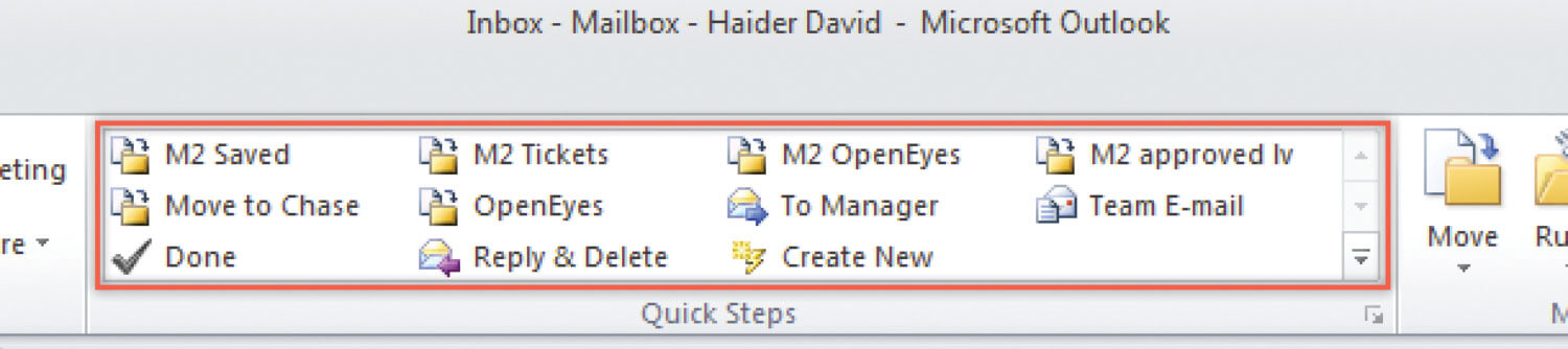 The Quick Steps panel is right at the top of Outlook in the middle of the tool bar (Figure 1). This tool allows you to save a sequence of steps and give that job a name. These saved sequences can then be run on demand. Some common uses are to move an email (or series of emails) to a pre-specified folder, or to forward the email to a particular person or group. Once the email to run the task on has been selected, the specified ‘Quick Step’ can be triggered by tapping the name in the panel or pressing a chosen keyboard combination. Get started by pressing the ‘Create New’ button and working through the box that appears (Figure 2).