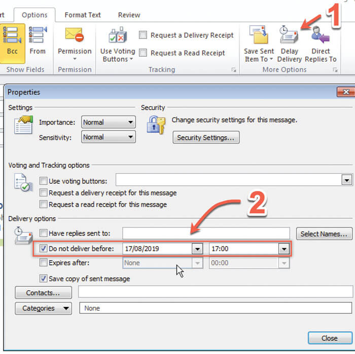 Occasionally it can be useful to write an email, but have it delivered at a specified time and date in the future, rather than when you press send. An example would be scheduling an email to be sent at 9am on a Monday morning, to maximise the likelihood of it being read. Simply open the options tab and click ‘Delay delivery’ (Figure 6, num 1). Then set the date and time in the box (Figure 6, num 2). Finally close the box and press ‘Send’ as usual. The email will move to your ‘Outbox’ and be sent at the requested time. If Outlook is closed and the computer turned off, the email will still be sent on time. The email can also be edited from the outbox until the chosen send time.