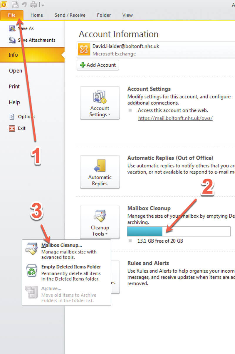 This tool is of use if you find yourself close to your provided storage limit. Requesting an increase in mailbox size is a good approach first. As an example, my IT department (Bolton FT) provides users with 20GB of storage. Reviewing your capacity (Figure 4, num 2) and accessing ‘Mailbox Cleanup’ (Figure 4, num 3) are both accessed from the ‘File’ panel (Figure 4, num 1).