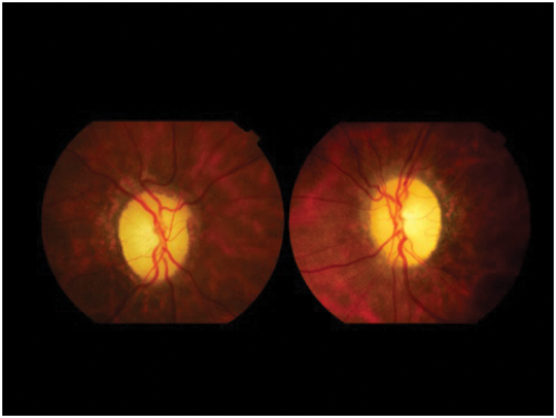 Figure 5: Optic disc photographs showing bilateral post papilloedema optic atrophy.