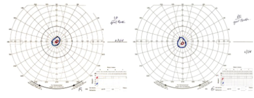 Figure 7: Goldmann visual fields showing tubular isopters as seen in post papilloedema optic atrophy.