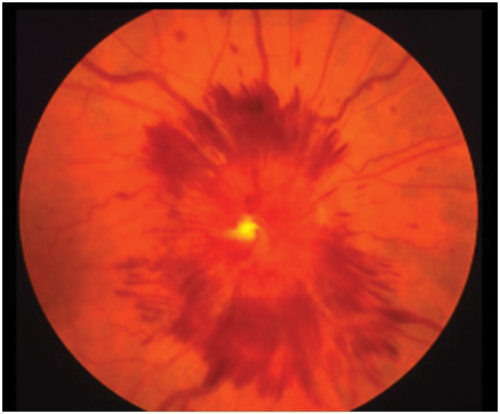 Figure 4: Optic disc photograph showing swollen disc with extensive surrounding haemorrhages.