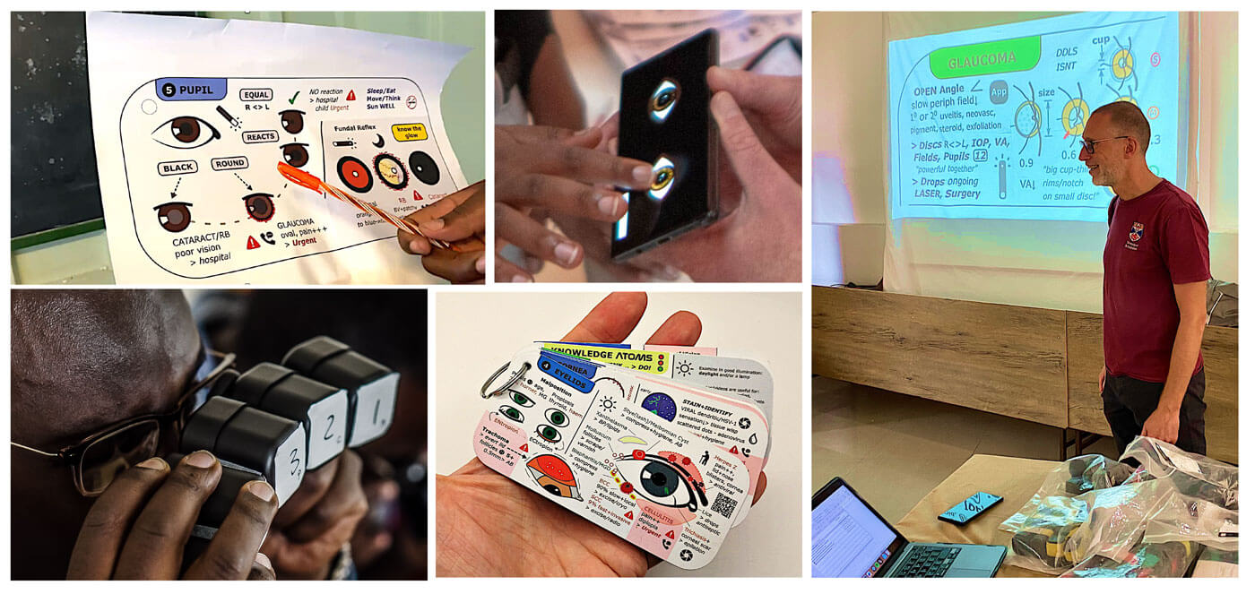 To maximise the potential of our devices we have gradually created a range of teaching materials and embedded these in interactive workshops. These workshops can be on broad topics such as Primary Eye Care (PEC) or newborn eye screening targeting community-level healthcare workers or more disease focussed (diabetic retinopathy, retinopathy of prematurity and glaucoma) targeting more specialised eyecare professionals. Different workshops consequently use different devices depending on the focus of the initiative and the type of healthcare professional being trained.