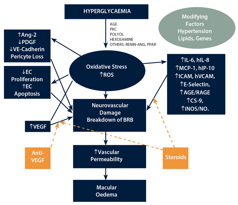 The molecular changes in DMO are due to the overproduction of reactive oxygen species (ROS) in the cellular mitochondria in the different cells, leading to oxidative stress and tissue damage through a number of major mechanisms (reviewed in Amoaku et al. 2015) [16], which are still not fully unravelled. Hyperglycaemia leads to activation of the protein kinase C (PKC) isoforms, over-activity of the hexosamine pathway, increased flux of glucose and other sugars through the polyol pathway, and increased intracellular formation of advanced glycation products (AGEs) and increased expression of the receptor for AGEs (RAGE). Other pathways include the renin-angiotensin and peroxisome proliferator-activated receptor gamma (PPAR-γ) (also known as the glitazone receptor) pathways (See Figure 1). The increased ROS may lead to inflammation by generating IL-1, IL-6, IL-8, MCP-1, iNOS, IP-10, MMPs (especially MMP9), C5-9 and TNF-alpha, as well upregulating endothelial adhesion molecules such as ICAM-1 (CD54) or E-Selectin (CD62E) [17-19], VCAM-1 (CD106) [20] and PECAM (CD31) in ECs.
