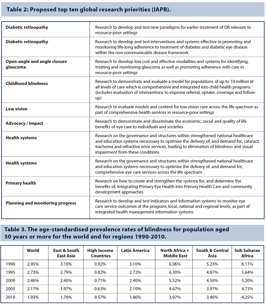 International partners include the International Council of Ophthalmology and International Agency for the Prevention of Blindness (IAPB). The latter represents an alliance of civic organisations, corporations and professional bodies promoting eye health through advocacy, knowledge and partnerships. It defines avoidable blindness as blindness which could be either treated or prevented by known, cost-effective means. In 2010 the IAPB developed via a VISION 2020 workshop a research plan and identified research areas and priorities for improved control of avoidable visual impairment and blindness over the next 10 years [3].