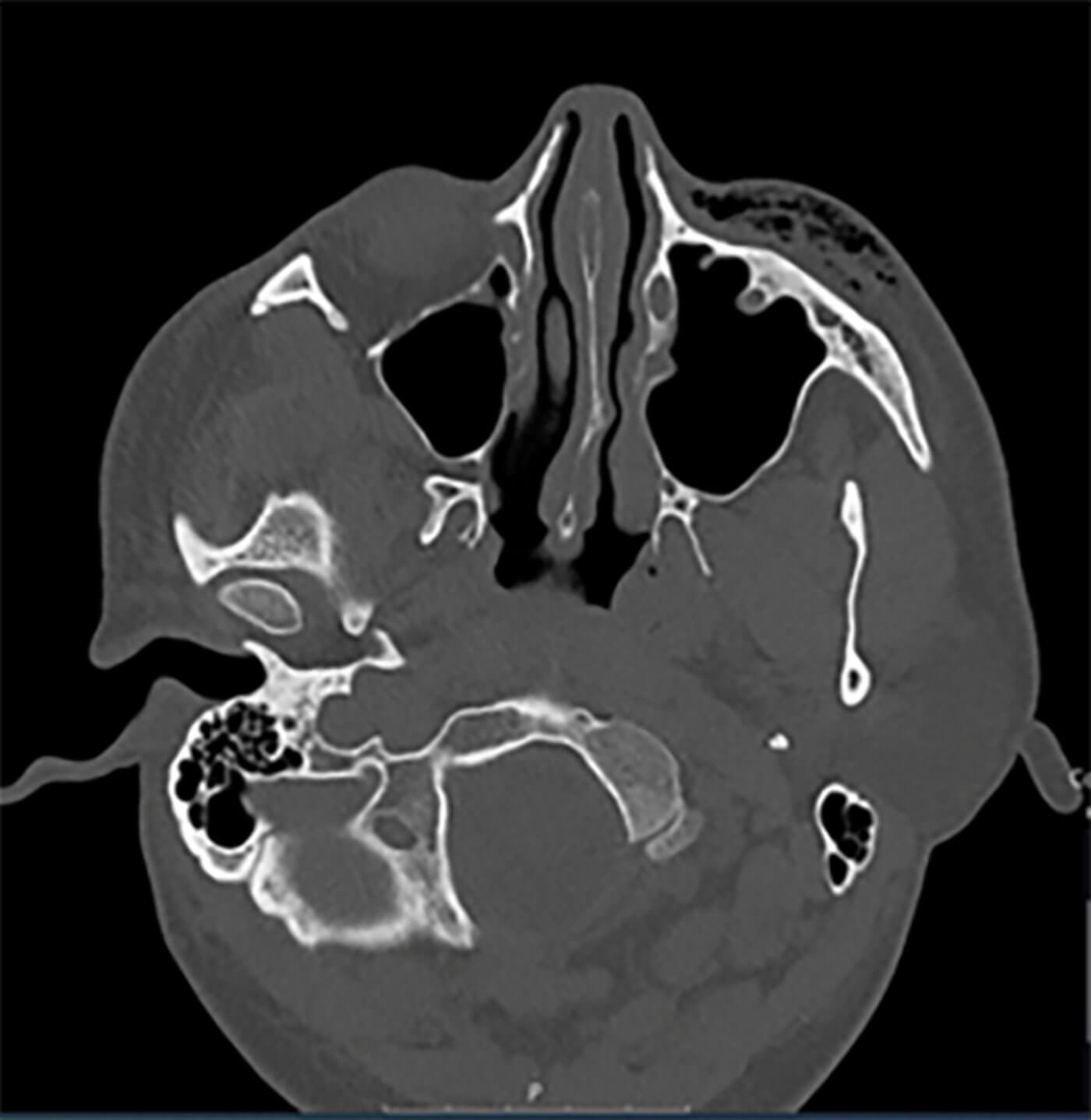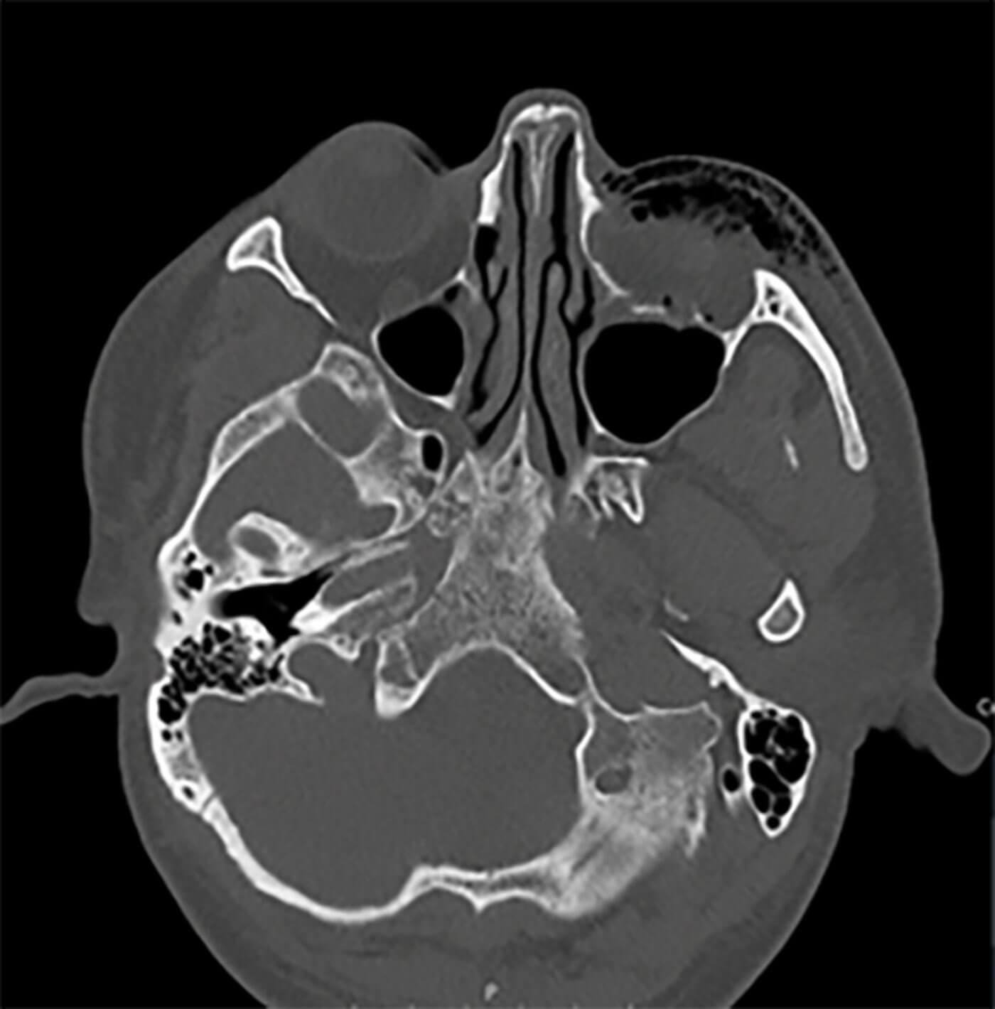 Figure 2: CT orbit demonstrating surgical emphysema in the left orbit.