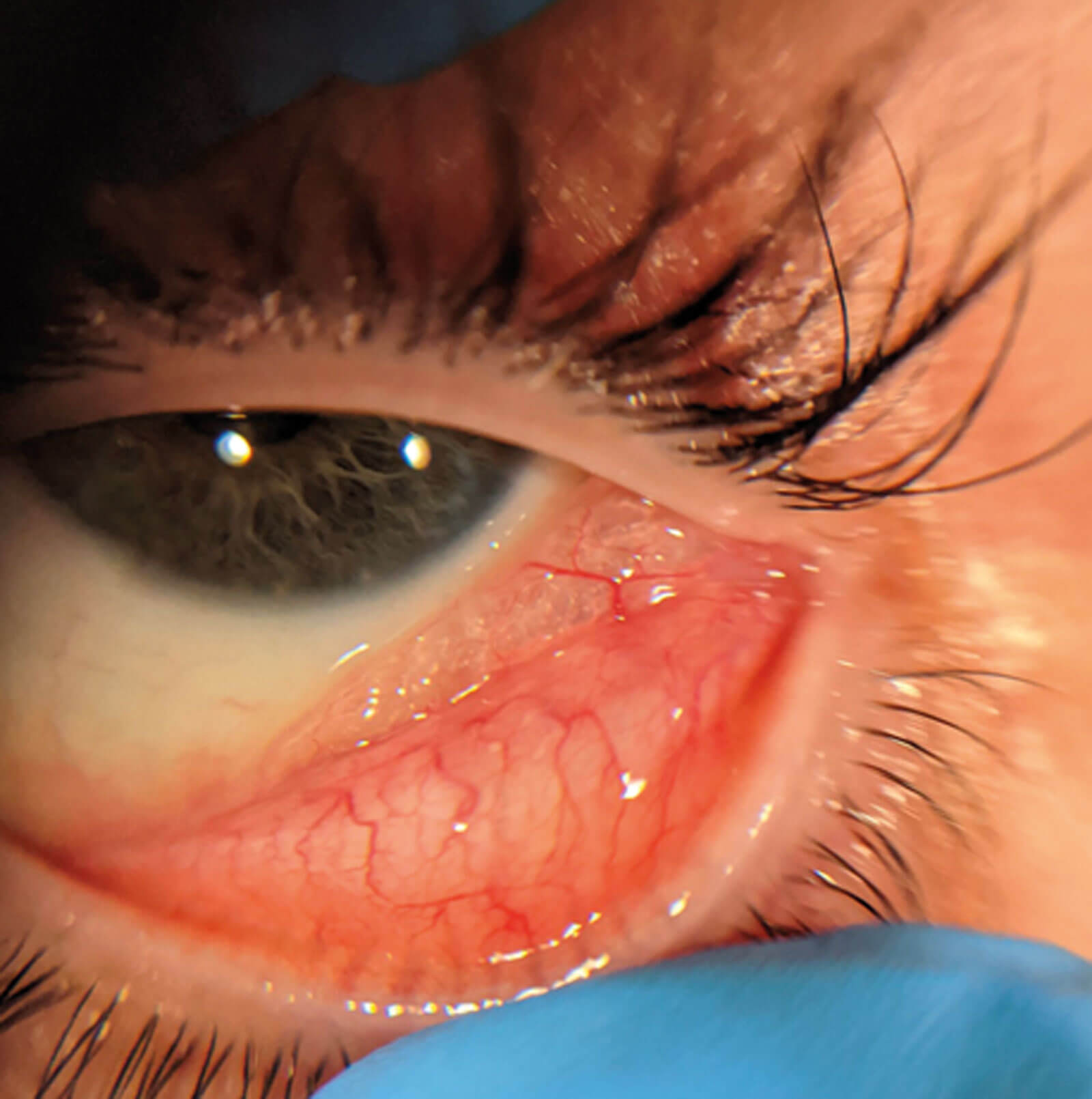 Figure 1: Conjunctival emphysema in the inferior temporal conjunctival fornix.