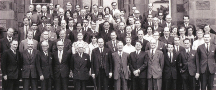 Figure 3: Photograph taken at the 100th meeting of Scottish Ophthalmological Club (SOC) in 1967 on the front steps of the old Royal Infirmary of Edinburgh. In the centre of the front row are Professor George Scott (President SOC) flanked by Sir Stewart Duke-Elder on his right and Professor Dott on his left. The author is in the second row fifth from right behind Professor Wallace Foulds.