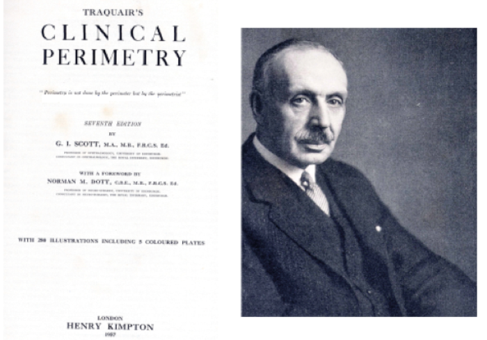 Figure 5: Dr HM Traquair and title page of Traquair’s Clinical Perimetry 1957. The sub-heading reads: “Perimetry is not done by the perimeter but by the perimetrist.” Photo courtesy of The Royal College of Surgeons of Edinburgh.