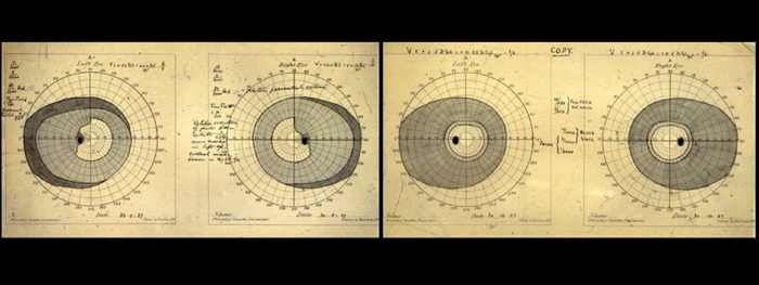 Figure 4: Pre (left) and postoperative (right) visual fields charted by Dr Sinclair in 1927 in the
