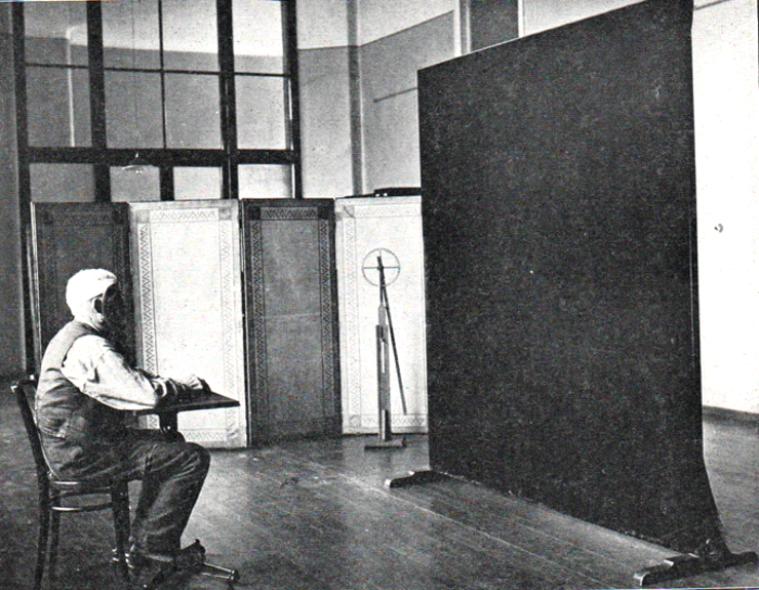 Figure 6: Photograph taken in the perimetry room of the old Eye (Moray) Pavilion of Edinburgh Royal Infirmary showing 2 metre Bjerrum screen, and on its left side Sinclair’s rule used for charting from the unmarked screen. From Traquair’s Clinical Perimetry. London: H Kimpton; 1957.