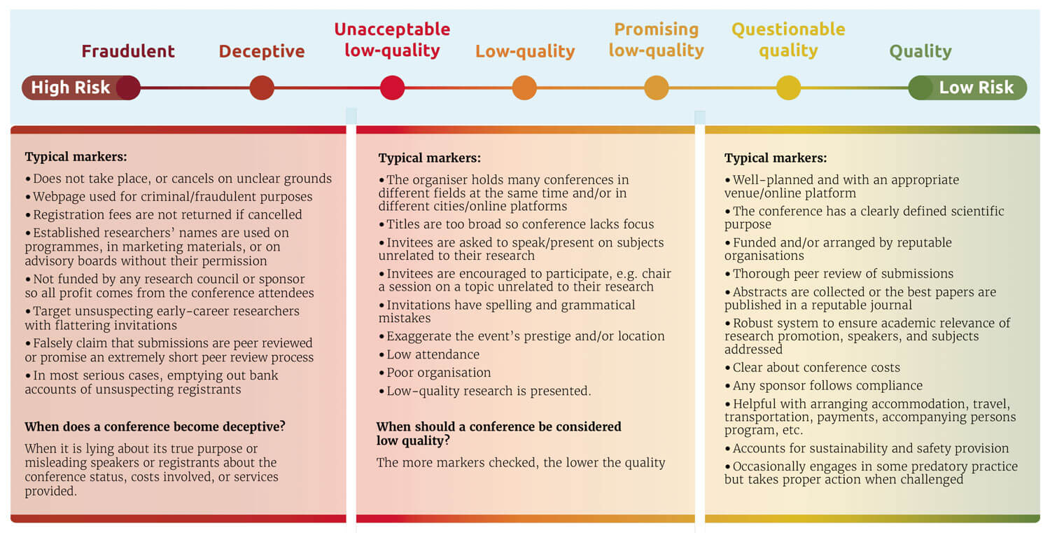 Predatory conferencing also represents an increasing menace and distraction, underscoring the need for guidance and vigilance on distinguishing between the trusted, scholarly research conference and the misleading or bogus event [4]. However, many researchers and clinicians appear unaware of the need to consider the authenticity or legitimacy of a journal or conference [1].