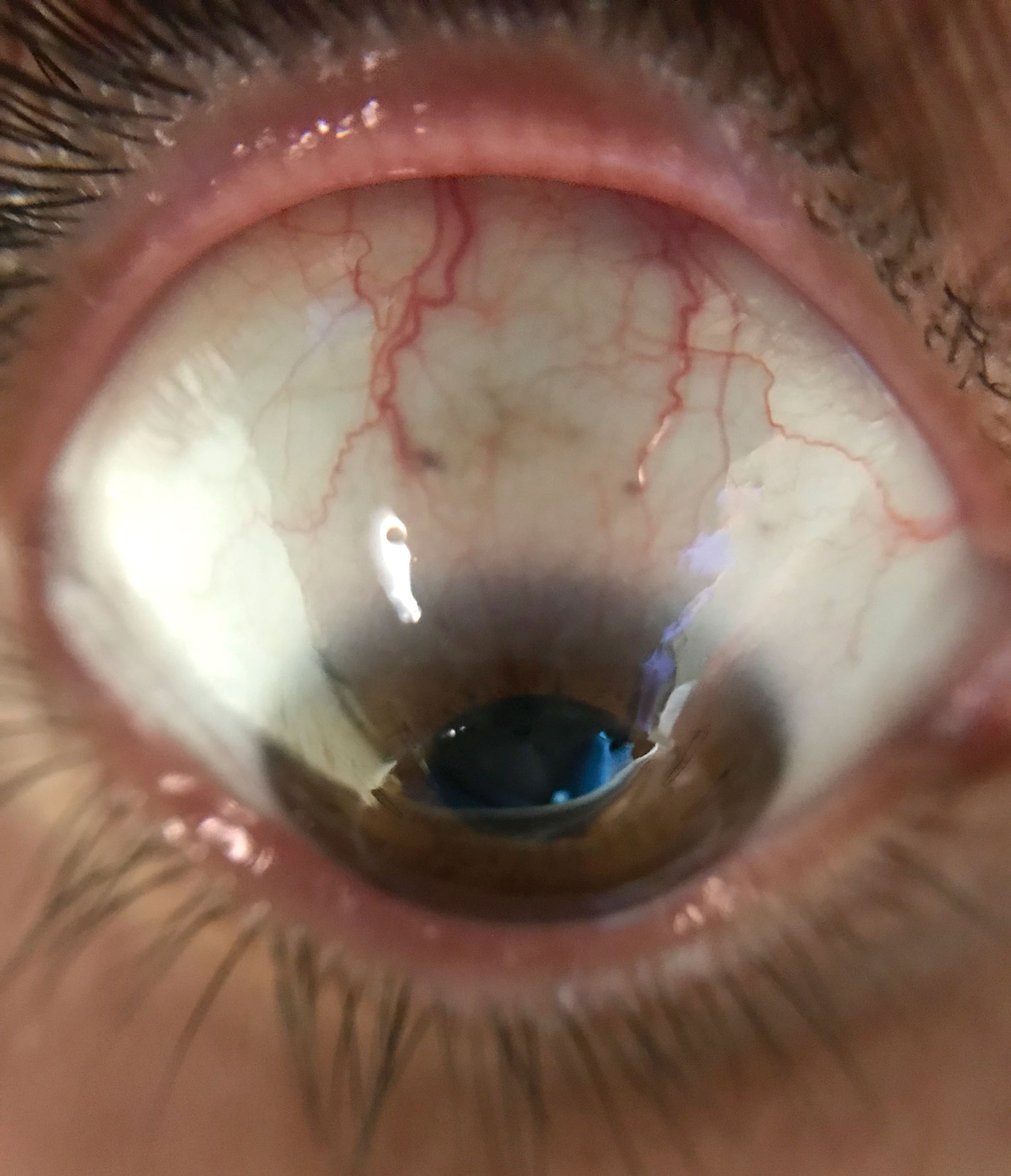 He had been off topical prophylactic steroid treatment prior to this review - this was not the clinical advice that had been given to him, but unfortunately, he had not managed to get a repeat prescription of the medication and therefore had been off steroid eye drops prior to the presentation. All corneal sutures remained in situ. On slit-lamp examination, there were early signs of stromal rejection with an area of superior conjunctival injection (Figure 1).