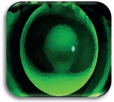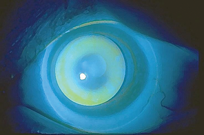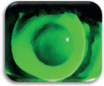 - Fluorescein facilitates the assessment of lens alignment viewed using the slit-lamp or a Burton lamp. The ‘fluorescein pattern’ intensity allows confirmation of either a steep or flat fit of the lens. One should note the fluorescein intensity in the centre of the lens, mid peripheral and periphery (Figures 1-5).