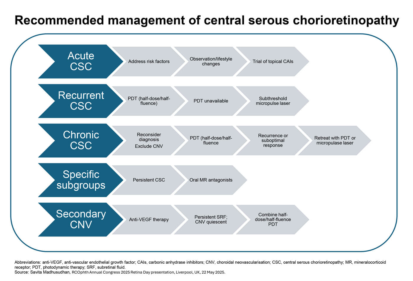 Figure 1: Abbreviations: anti-vascular endothelial growth factor (anti-VEGF); CAIs, carbonic anhydrase inhibitors (CAIs); choroidal neovascularisation (CNV); central serous chorioretinopathy (CSC); mineralocorticoid receptor (MR); photodynamic therapy (PDT); subretinal fluid (SRF). Source: Savita Madhusudhan, RCOphth Annual Congress 2025 Retina Day presentation, Liverpool, UK, 22 May 2025.