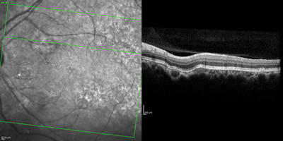 1. This shows pigmentary mottling in the affected area along with scattered drusen on the posterior pole. 2. Spectral domain optical coherence tomography (SD-OCT) shows unusual excavation of the choroid with outer retinal layers and retinal pigment epithelium (RPE) conformed with lesion excavation; the chorioscleral interface appears normal, without any ectasia or posterior staphyloma. Autofluorescence (AF) confirms the hypoautofluorescence in the area of choroidal lesion.