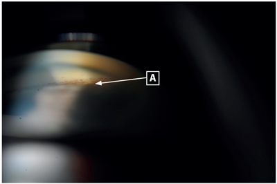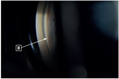 Figures 2 and 3: Gonioscopy revealed no visible angle structures in both eyes (Shaffer grade 0), the left eye demonstrating extensive peripheral anterior synechiae and the right eye demonstrating appositional closure. A: pigment above Schwalbe’s line from previous appositional closure, now synechial closure in left eye. B: indentation gonioscopy of right eye demonstrating angle opening to reveal trabecular meshwork.