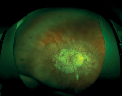 Figure 4: Wide-field fundus image of the left eye. Typical myopic fundus with extensive peripapillary atrophy.