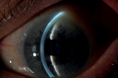 On examination, visual acuity was 6/96 in the right eye and 6/192 in the left eye. Intraocular pressures measured 11mmHg in the right eye and 40mmHg in the left. The left eye was injected, with a mid-dilated, non-reactive pupil and the cornea was cloudy. The anterior chamber appeared shallow in both eyes and there was cataract present in both eyes (nuclear sclerosis) (Figure 1). Gonioscopy revealed no visible angle structures in both eyes (Shaffer grade 0), with the left eye demonstrating extensive peripheral anterior synechiae and the right eye demonstrating appositional closure (Figures 2 and 3). There was no evidence of neovascularisation of the anterior segment.