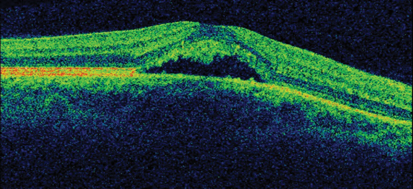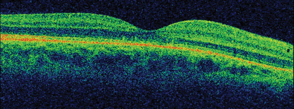 3. There is significant evidence for different therapeutic options to be effective in CSR. First of all, observation is more than an appropriate initial approach to this disease. In addition, it is important to withdraw potential causative factors such as steroids or stress. We adopted a stepwise approach to treatment of this young patient. After a month of observation without improvement, he was commenced on low-dose aspirin for a period of four weeks. There is limited evidence for the role of aspirin in CSR, mostly originating from case series and case-control studies and it is based on its plasminogen activator inhibition effect. As there was no clinical improvement with aspirin, the patient was placed onto oral carbonic anhidrase inhibitor therapy (Acetazolamide) for a period of four weeks as a second-line therapy but did not show improvement. Both aspirin and carbonic anhydrase inhibitors may shorten clinical resolution but current evidence does not support them neither to improve final visual acuity nor to reduce recurrence rate. Three months after onset and given the persistence of both macular fluid and symptoms, the patient received photodynamic therapy (PDT) carried out at half-fluence (25mj) covering the area of choroidal hyperpermeability on ICG. The anatomical result of such is shown in OCT in Figure 3. In addition, the patient reported a complete resolution of his ocular symptoms. He remains stable after four months of PDT.