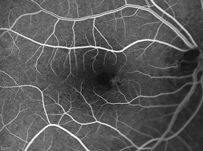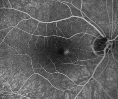 2. Note in Figure 2 a hyperfluorescent tiny roundish area visible in early phases very close to the fovea. Observe how the dye pools this area in late phases of the angiogram, but without any evident extravasation. There are two main angiographic patterns in classic CSR. The one present in our patient is called ink blot leakage, and presents as a single hot spot which becomes more hyperfluorescent as the dye pools within the subretinal fluid overtime. The other most common pattern is called smokestack leakage, which typically presents with a small ascending single smokestack leak as the dye fulfils the detached subretinal space. Lesions can be multiple in some patients.