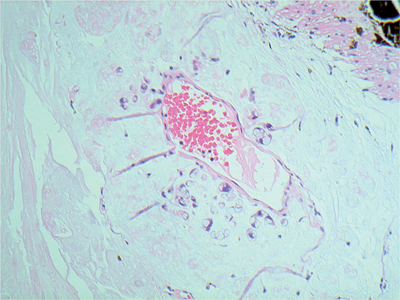 A 60-year-old man presented to the ophthalmologists with painful blurred left vision. Examination revealed a white vascular mass, occupying 60% of the anterior chamber space, arising from the iris. After conservative therapy, no useful vision remained. The eye was still painful and blind and enucleation was performed.
