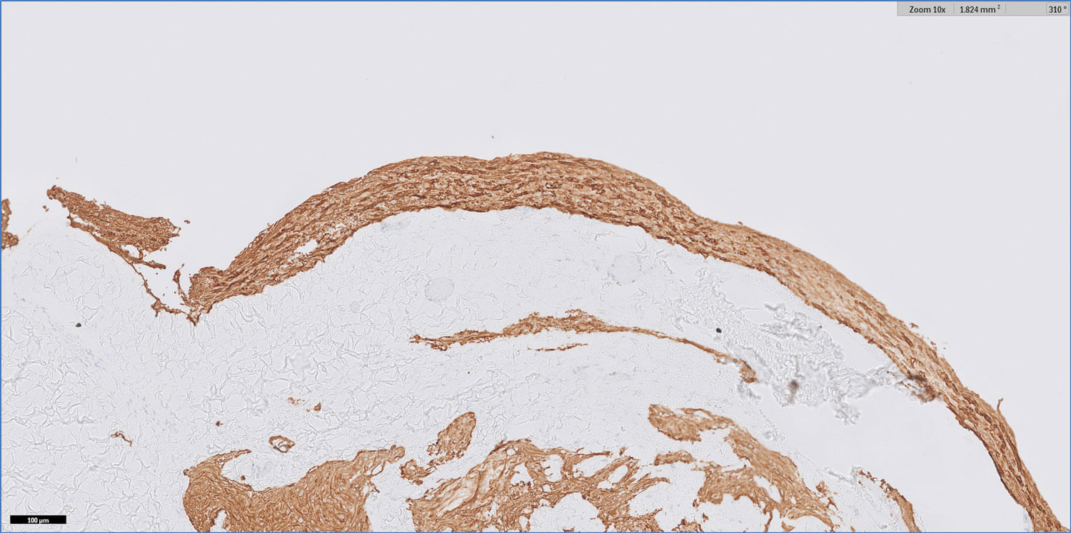 - Figures 1 and 2 show a thick collagenous cyst wall lined by glial cells. Immunohistochemical staining is strongly positive for GFAP (Figure 3). Synaptophysin did highlight the neuroretinal tissue (not shown here). Pancytokeratin (AE1/AE3) was negative.