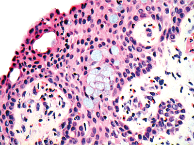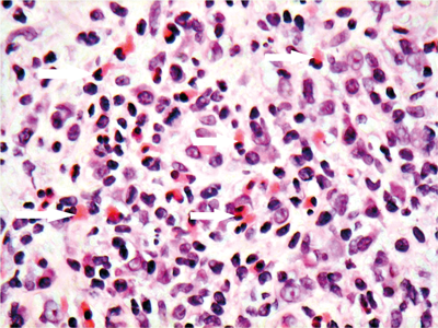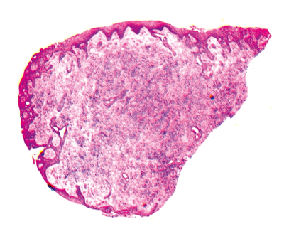 Examination shows bilateral mucoid discharge, conjunctival injection and eversion of both upper lids reveals some dome-shaped lesions. One of these is biopsied and shown in Figures 1, 2 and 3. The eyelid skin is not involved.