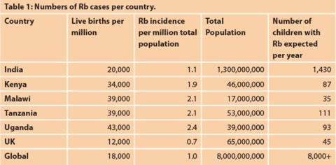 The results of the questionnaire, completed by each centre prior to attending, showed two main findings. Firstly the number of cases per live births was very similar across the centres, indicating that most children with Rb are seen by medical services (although this is often very late in the disease progression). Secondly the results suggested that different protocols were in use in different countries.