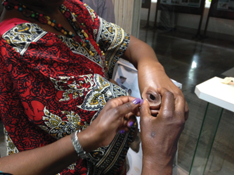 Reviewing prosthetic eyes during the tour of LVPEI Rb services.
