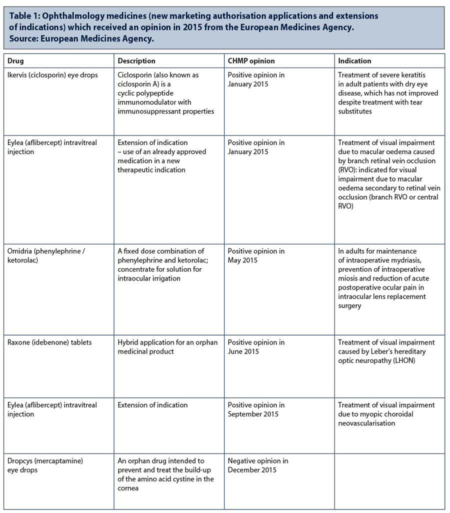 In 2015, the EMA recommended 93 medicines for marketing authorisation, including 39 new active substances (one third for the treatment of cancer). There were 54 extensions of therapeutic indications, as well as approval of 18 orphan medicines, and three medicines authorised under exceptional circumstances. Table 1 shows ophthalmology medicines which received an opinion from the EMA in 2015 (new marketing authorisation applications and extensions of indications).