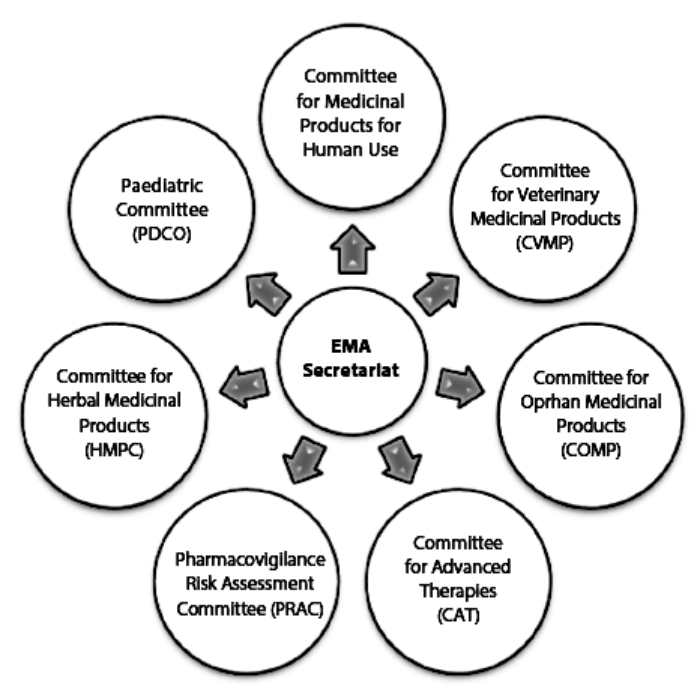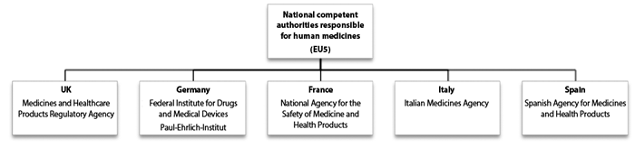 The EMA is the body in the European Union (EU) responsible for the evaluation, supervision and pharmacovigilance of medicine products. The EMA also supervises the safety of medicines in the EU after they have been authorised, and can also give scientific opinions on medicines at the request of member states or the European Commission. Following authorisation, EMA and the national competent authorities of the EU continue to monitor the benefits and risks associated with an approved medicine in real life, and provide updated safety advice where applicable to enable informed decisions when using or prescribing a medicine. Figure 1 shows the main scientific committees of the EMA and Figure 2 details the national competent authorities of the EU5 countries.