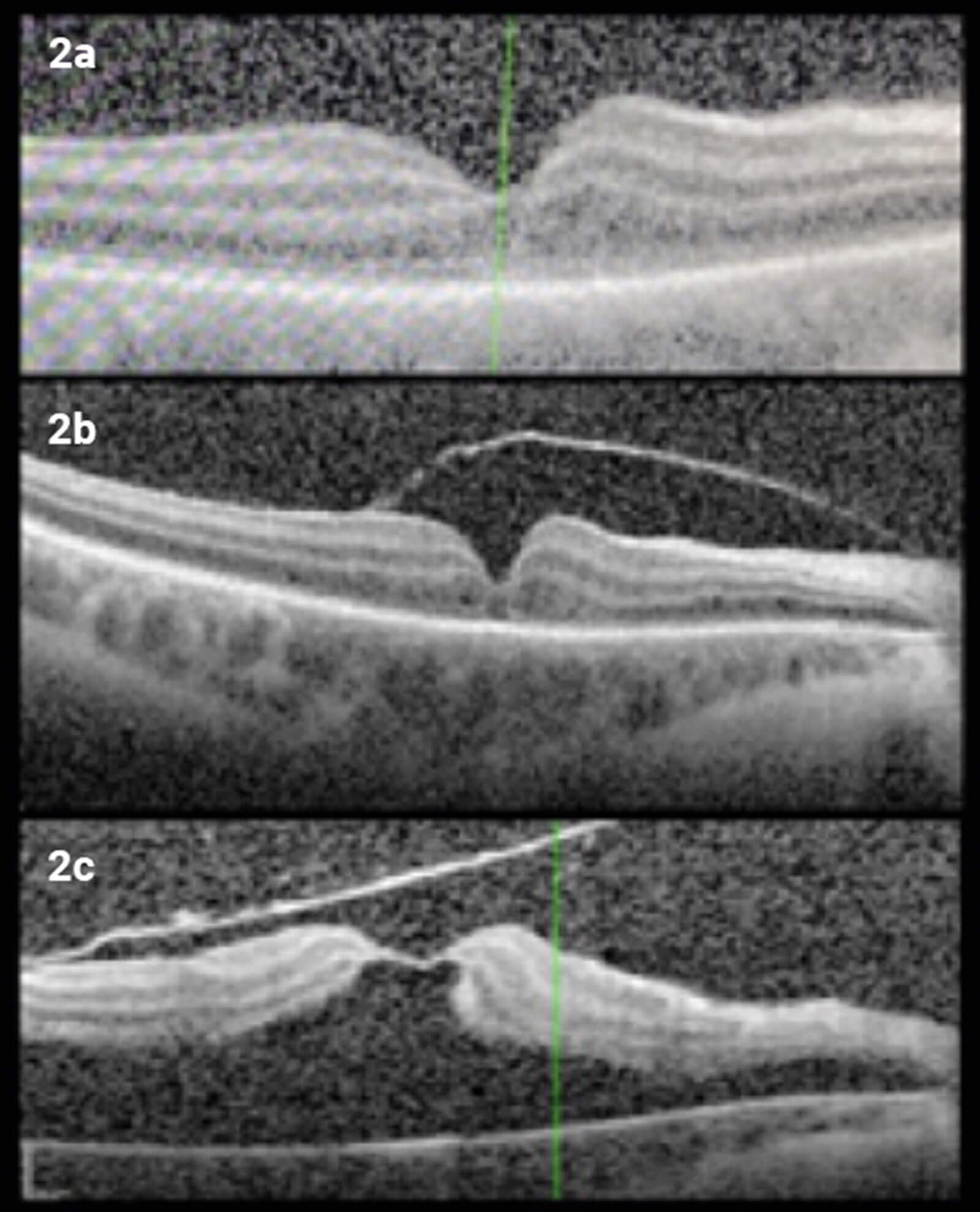 Figure 2: From top to bottom, OCT macula of the right eye: (2a) showing hyporeflectivity of the GCL and relative increase of reflectivity of the plexiform layers; (2b) one week later, showing development of partial PVD; and (2c) one month later, showing macular detachment and macular hole with only a thin roof of internal limiting membrane.