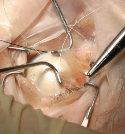 - Suturing the muscle for a recession or resection, but this time having to negotiate the conjunctiva and Tenon’s. Again the technique can vary using continuous or interrupted sutures, with a fixed or non-fixed hangback technique.