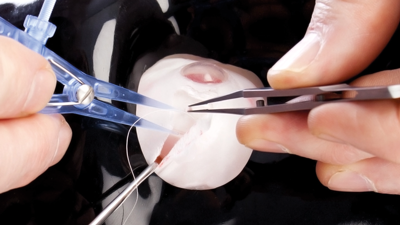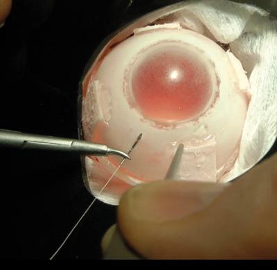 - 10 minute tutorial with trainer to make sure the correct instrument handling and basic suturing techniques (as taught on the RCOphth Microsurgical Skills course) are sound (Figure 6). The trainee can then take the head and basic strabismus eyes home to practise.