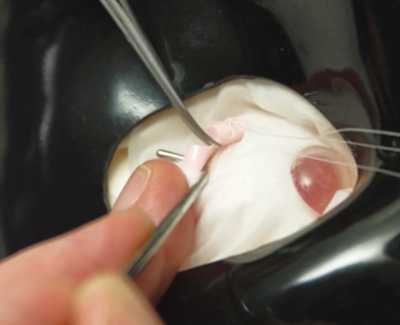 The technical aspects of adjustable suture strabismus surgery can be taught using these simulation methods, i.e. how to tie an adjustable knot and how to advance or recess the muscle. However, with a little bit of imagination simulation can be made very much more ‘life-like’. All experienced strabismus surgeons will have encountered unexpected difficulties whilst trying to carry out postoperative adjustments, such as the adjustable knot becoming fixed, the suture breaking or snagging on Tenon’s capsule, or the patient becoming distressed during the adjustment process. All of these problems can be simulated using the model eyes by tampering with the knot or intentionally fraying the suture to weaken it, or simply by shaking the head and adding a few sound effects during the adjustment! Of course the trainee should not be told beforehand what is going to happen, so adding to the drama! Other intraoperative mishaps such as a ‘lost’ or slipped muscle can also be simulated, by putting traction on the appropriate muscle (Figure 9).