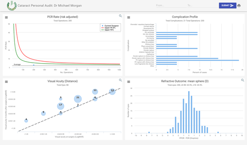 Surgeons are encouraged to submit anonymised patient data to The Royal College of Ophthalmologists’ National Ophthalmology Audit to ensure the public will have visibility of outcomes by surgeon and centre. Because all data in the Medisoft system are structured consistently, the relevant data can be extracted automatically, with no effort or change in working practice required.