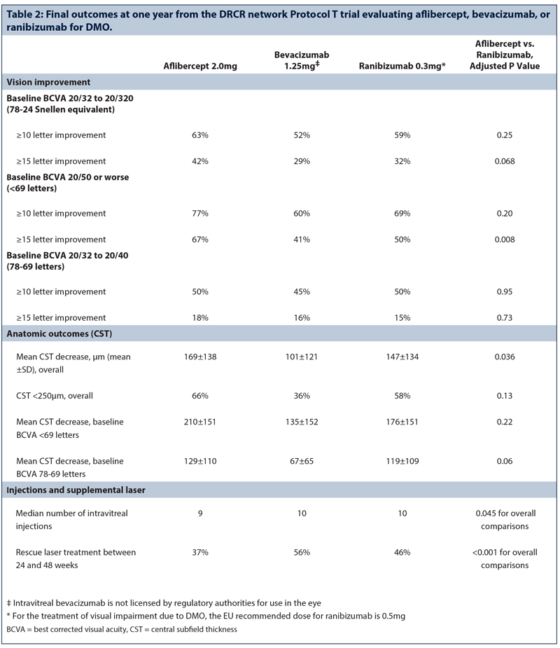 Overall, Protocol T showed that ranibizumab and aflibercept are superior to bevacizumab for DMO, while greater visual acuity improvement on average was seen with aflibercept than with the other agents.