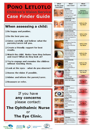 - Child eye health part of the Child Welfare Clinic Card, which few other African countries have yet done, providing an opportunity to identify and treat children early.
