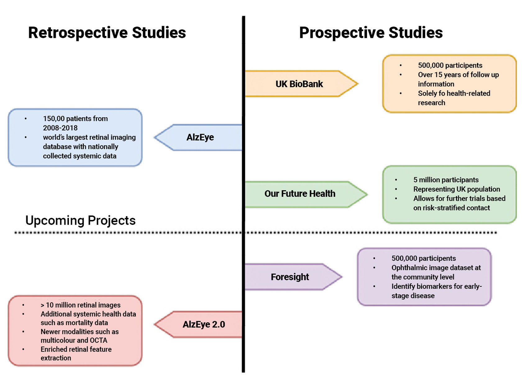 Retrospective studies like AlzEye, where retinal imaging data from >150,000 patients at Moorfields Eye Hospital attending between 2008 and 2018 has been linked with systemic diagnoses from hospital admissions, have been instrumental in identifying associations between ocular biomarkers and systemic diseases. Analysis of high-dimensional data in AlzEye enabled researchers to uncover patterns related to cardiovascular and neurodegenerative conditions [11]. Building upon this strong foundation, there is an opportunity to enrich the dataset by including more recent patient data and expanding collaborations with additional ophthalmic centres. This will increase the sample size and diversity of the population studied, enhancing the robustness of analyses and providing more comprehensive insights.