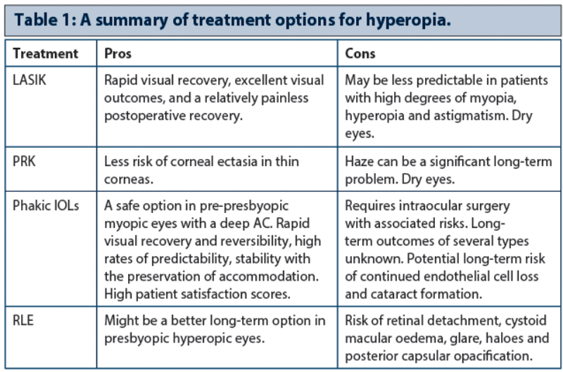 This article has reviewed the main evidence-based surgical options for hyperopia. There are several excellent options with the optimal choice of procedure being dependent on the level of refractive error, age of the patient and the unique anatomical factors in each case.