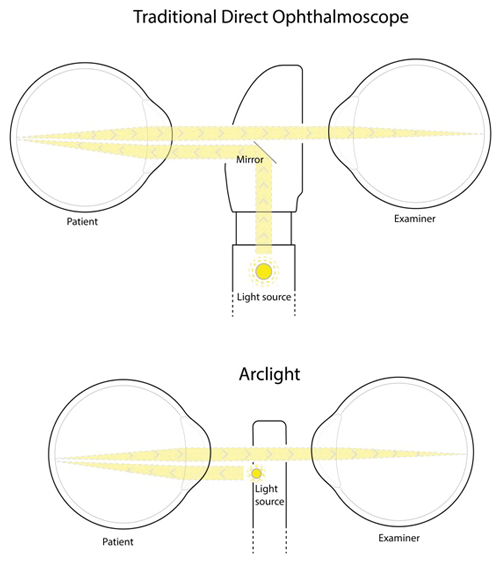 Figure 2: Simplified light paths from an Arclight compared with a conventional direct ophthalmoscope.