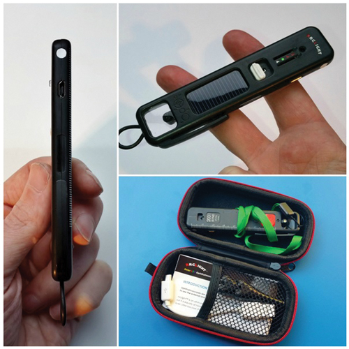 Figure 1: The Arclight: (clockwise from left); side view; rear view illustrating the ophthalmoscope-end, the loupe-end and the solar panel; the complete kit includes a carrying case, charging cable, instructions, two disposable speculae (4.5mm and 2mm) and a lanyard.