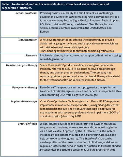 Multiple visual prosthetic projects and other vision regeneration initiatives being tested in preclinical and clinical development worldwide illustrate continuing progress and opportunities in addressing profound blindness from hereditary retinal diseases and other causes (Table 1).