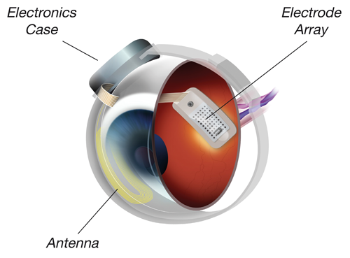 The Argus II system comprises implanted and external components, providing direct stimulation of the relatively preserved inner retina via epiretinal microelectrodes, thereby replacing the function of the degenerated photoreceptors. Implanted components are secured to the eye with a scleral band and sutures, and the 60-electrode array is tacked over the macula. Visual information from a glasses-mounted video camera is converted to a pixelated image by an external processor, before being transmitted to the microelectrode array at the macula. Elicited retinal responses are relayed via the optic nerve to the cortex for interpretation.