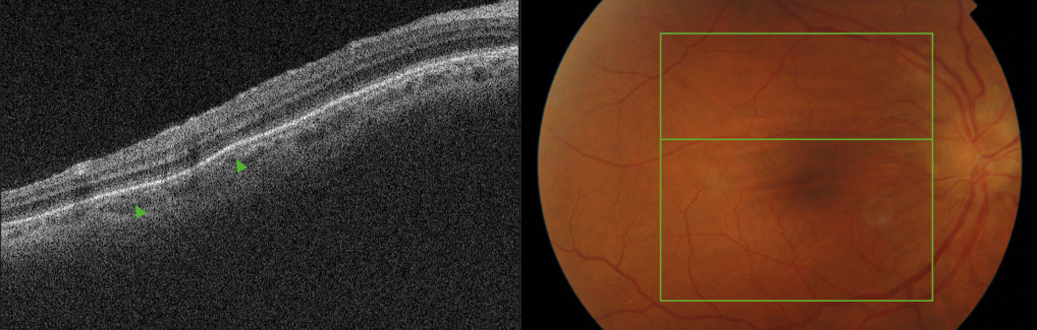 The horizontal orientation of choroidal folds often makes their detection difficult on a horizontal line OCT. In Figure 2, the subtle choroidal undulations are visible to the keen eye, an observation that would be much more conspicuous on a vertical line scan [3].
