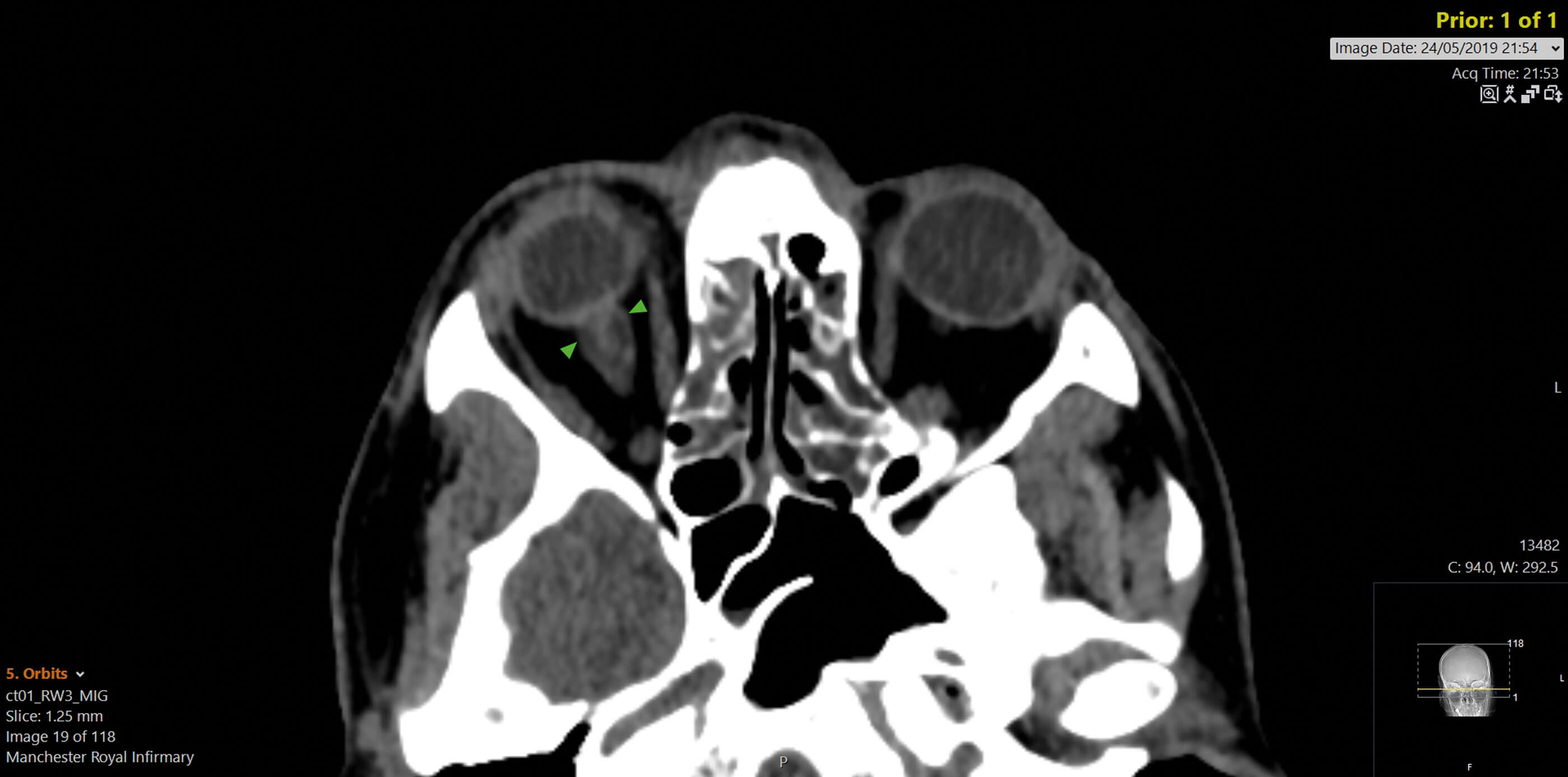 Tumour, hypotony, inflammation and retrobulbar mass were excluded. The appearance of the optic discs raised suspicion for grade one papilloedema bilaterally. He was urgently referred to the medical team, where a computed tomography (CT) scan revealed evidence of chronic raised intracranial pressure with dilatation of the optic nerve sheaths (Figure 3) and an empty sella. Lumbar puncture demonstrated raised opening pressure with normal cerebrospinal fluid (CSF) composition. He was eventually diagnosed with idiopathic intracranial hypertension and managed medically with success.