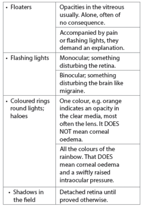 With the proviso that you must elicit a history rather than be swept aside by it, what patients tell you must be your guide to what bit of the eye is affected and how.