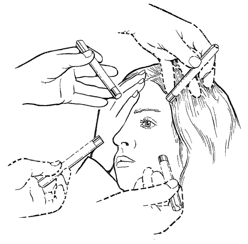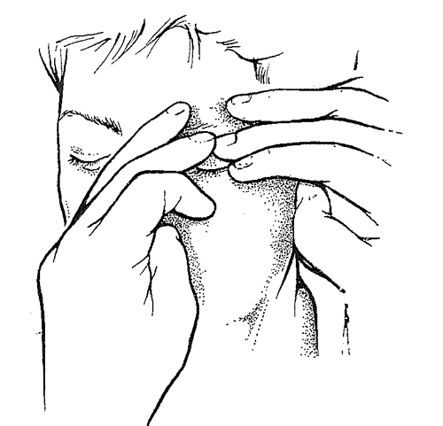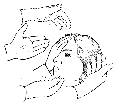 Figure 11: Not everyone has access to a tonometer. The hands lean on the forehead, while the index or middle fingers are held firmly together pulp to nail and firmly on the eye above the lateral end of the tarsal plate. A slight movement of one finger sets up a shimmer of fluctuation that is sensed by the other finger. This technique may record ‘hard’ by mistake but never ‘soft’ by mistake.