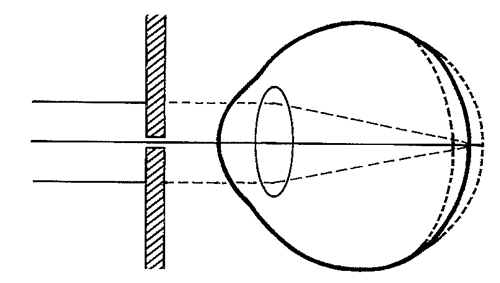Figure 2: Every bundle of rays from every point is reduced to one ray and each one of them is in focus. The ray through the macula is the vital clinical one. If the central vision improves with a pinhole, it can improve with glasses.